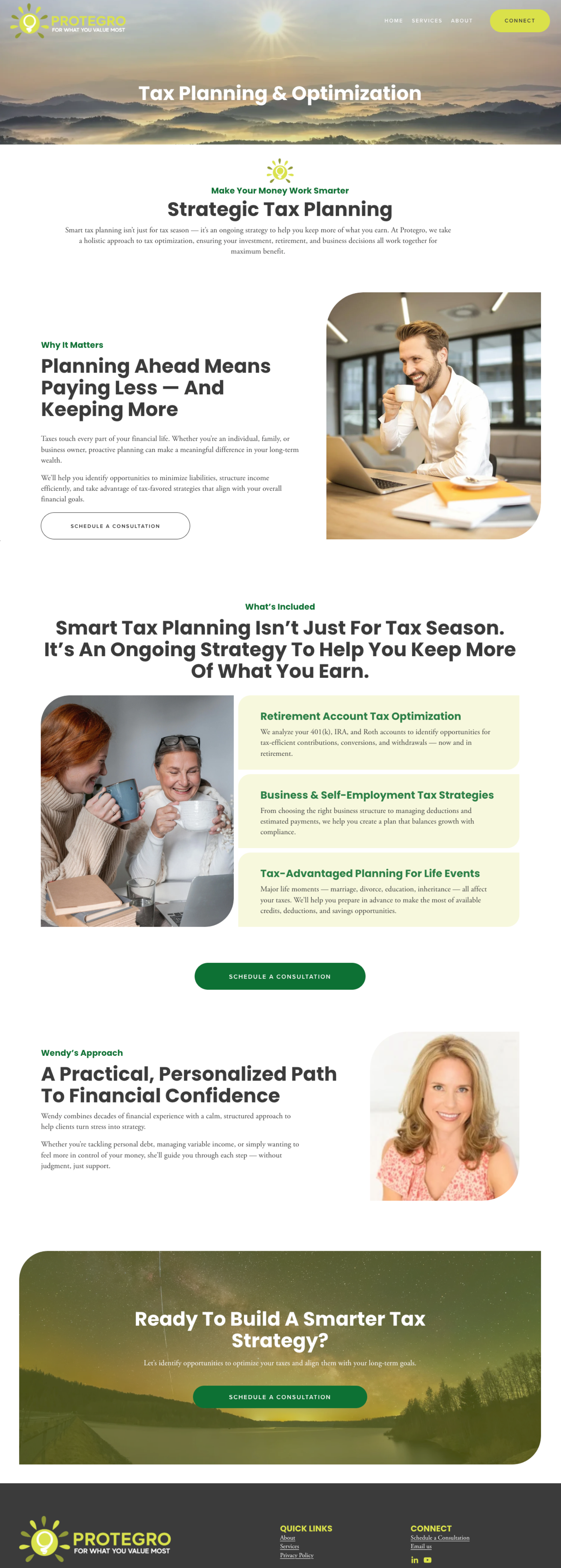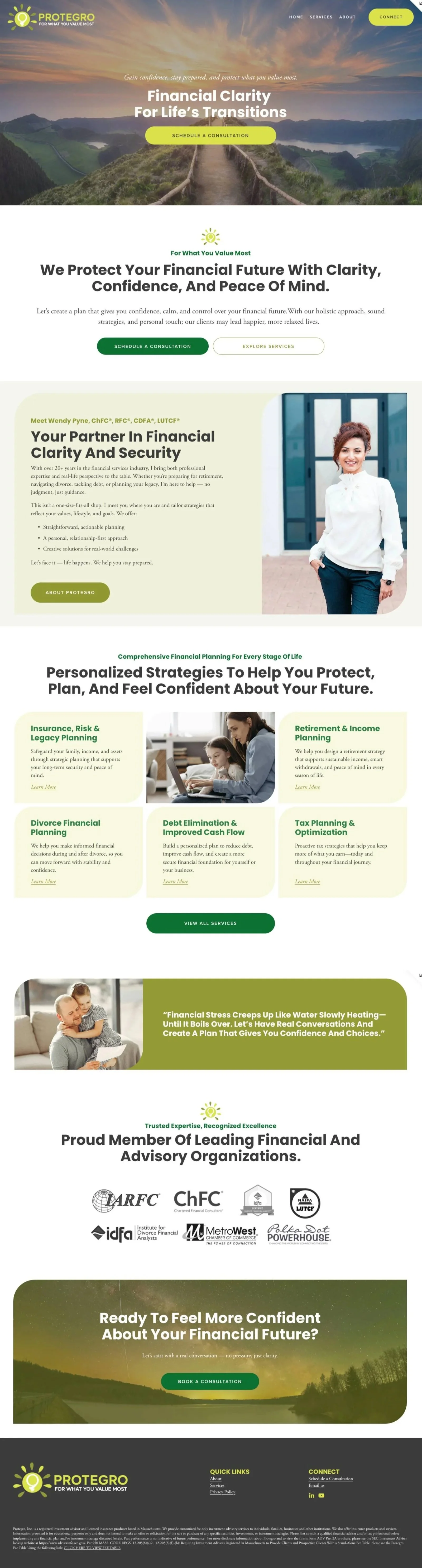 Protegro is a financial planning firm dedicated to helping individuals and families create financial clarity, confidence, and security. When Wendy reached out, her existing Squarespace website was very basic, limited in structure, and no longer reflected the professionalism or depth of her services.